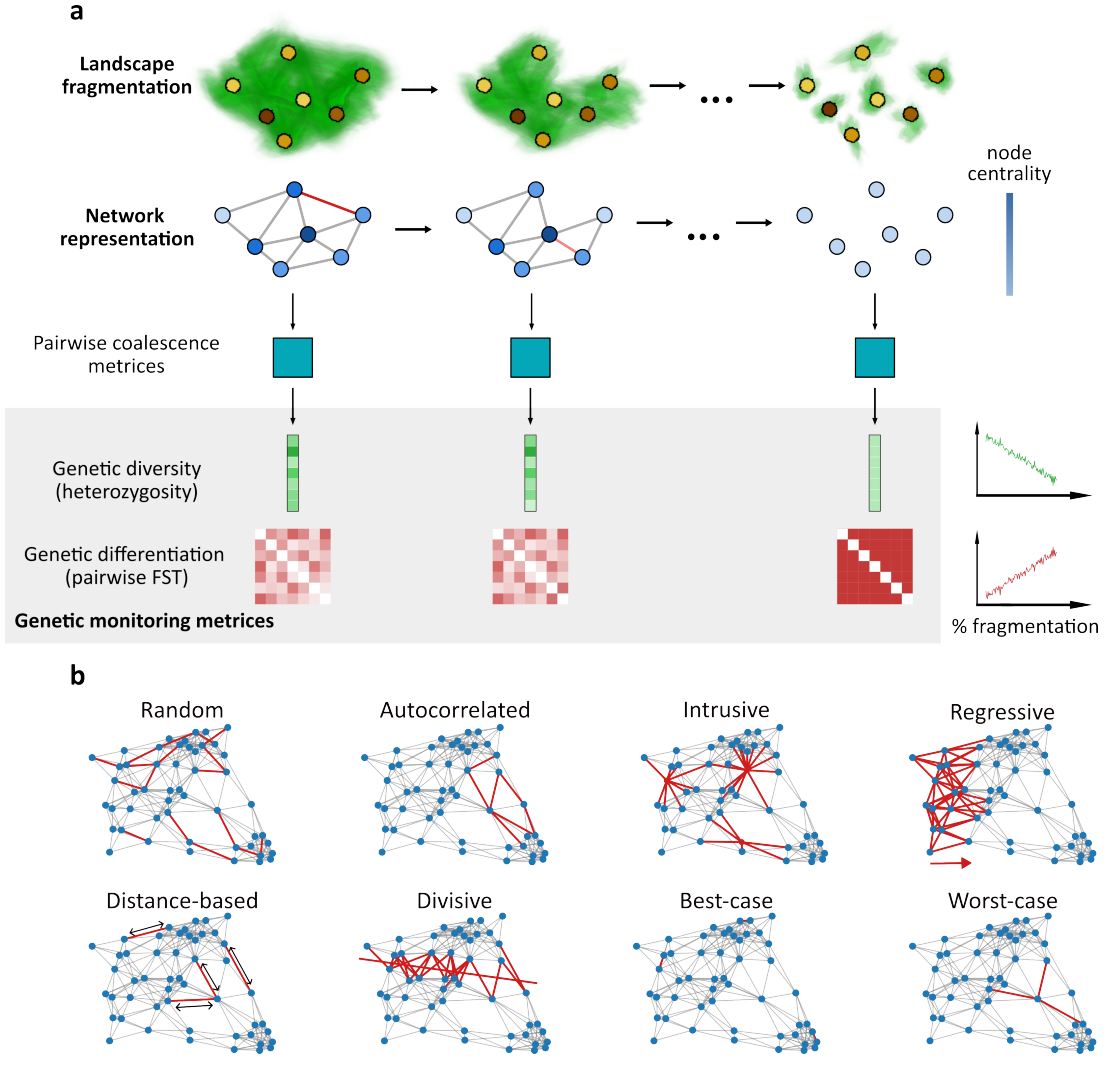 Habitat fragmentation is one of the most immediate and substantial threats to biodiversity, generating isolated populations with reduced genetic diversity. Genetic monitoring has become essential for detecting fragmentation and tracking its progress. However, the coherentinterpretation of geneticmonitoring data and understanding the genetic consequences of fragmentation require frameworks that accurately represent real-world complexity. Existing theoretical frameworks typically rely on simplified spatial structures and do not adequately capture the heterogeneous migration patterns of natural populations. Here,we integrate network theory andmathematical population geneticsto develop a framework forstudying the genetic consequences of fragmentation processes, explicitly accounting for heterogeneous connectivity and temporal dynamics. We apply this framework to examine how different fragmentation processes affect genetic measures commonly used in genetic monitoring. Through analysis of simulated and empirical networks, we find that different fragmentation scenarios produce substantially distinct trajectories in key genetic measures, sometimes exhibiting rapid transitional dynamics. Furthermore, fragmentation can cause deviations from classical theoretical expectations, such as the expected correlation between genetic and geographic distance (isolation-by-distance) or between genetic diversity and connectivity. Finally, we propose and demonstrate detectable early warning signals in genetic monitoring data that precede rapid transitional phases. Our framework thus provides a practical interpretation of genetic monitoring data, and a proof-of-concept that bridges the gap between idealized theoretical models and real-world connectivity dynamics.